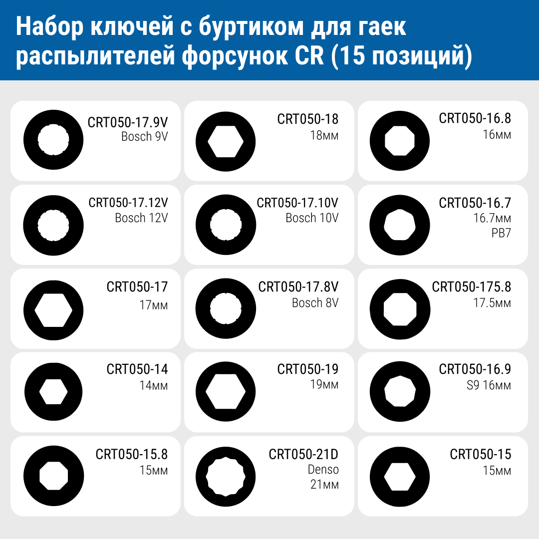 Комплект ключей с буртиками предназначен для затягивания гайки распылителя форсунок CR любых производителей: